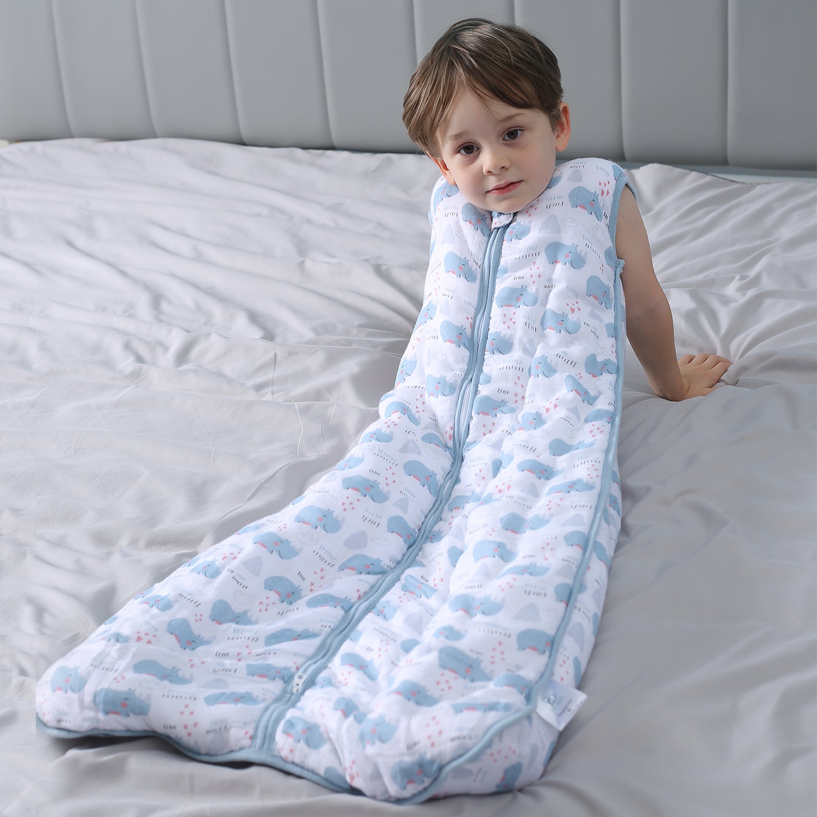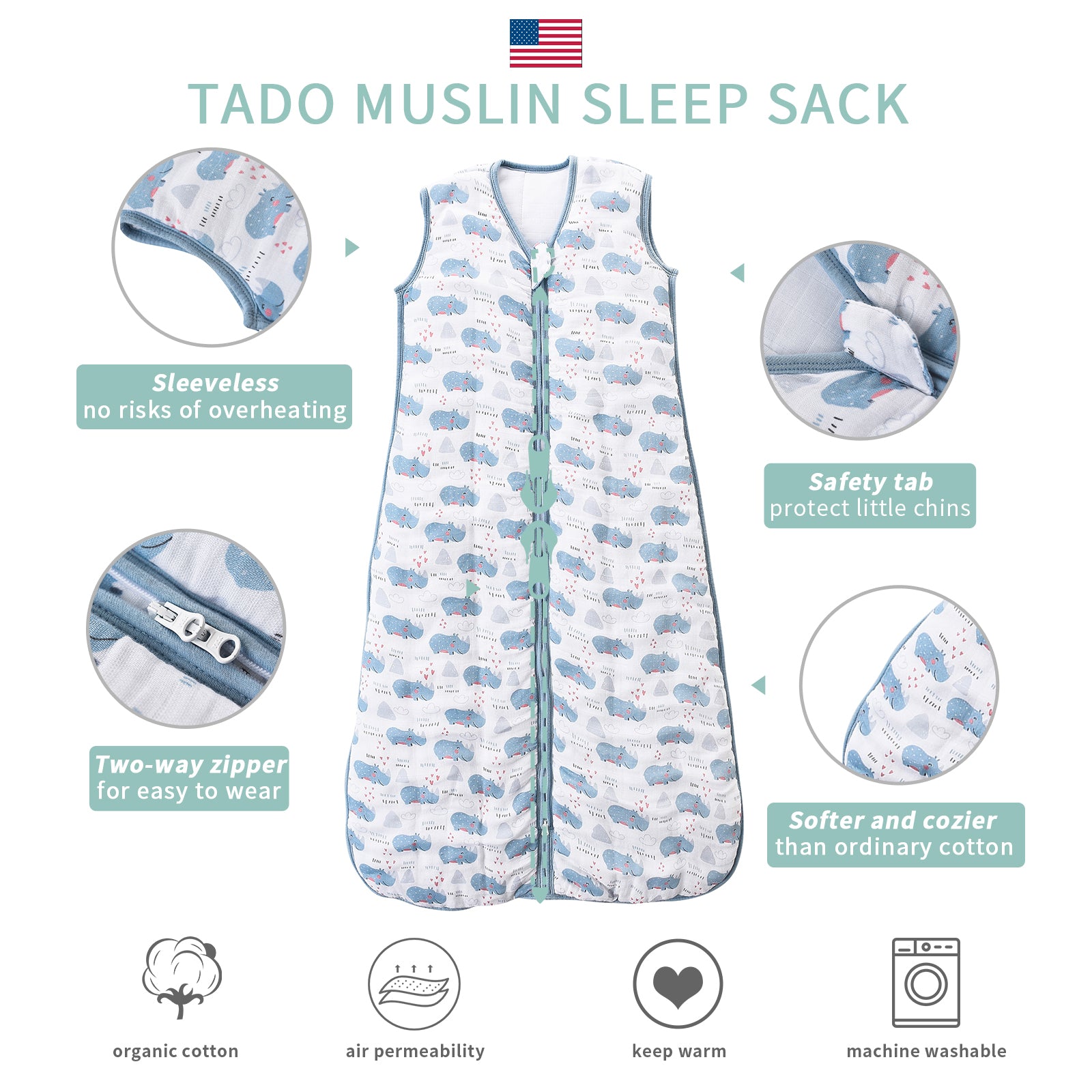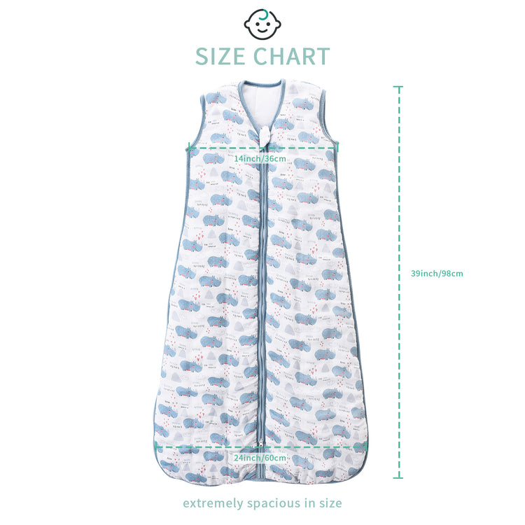 70% Bamboo & 30% Cotton Quilted Sleep Sack: This fabric is made from bamboo (70%) and cotton (30%). The sleeping sack is filled with 100% recycled polyester fiber filling and washed cotton with a 2.5 TOG rating for an ultra-soft and cozy feel, making it perfect for cool and cold conditions. The muslin material is more breathable than knitted fabrics, providing a comfortable sleeping environment for your baby.